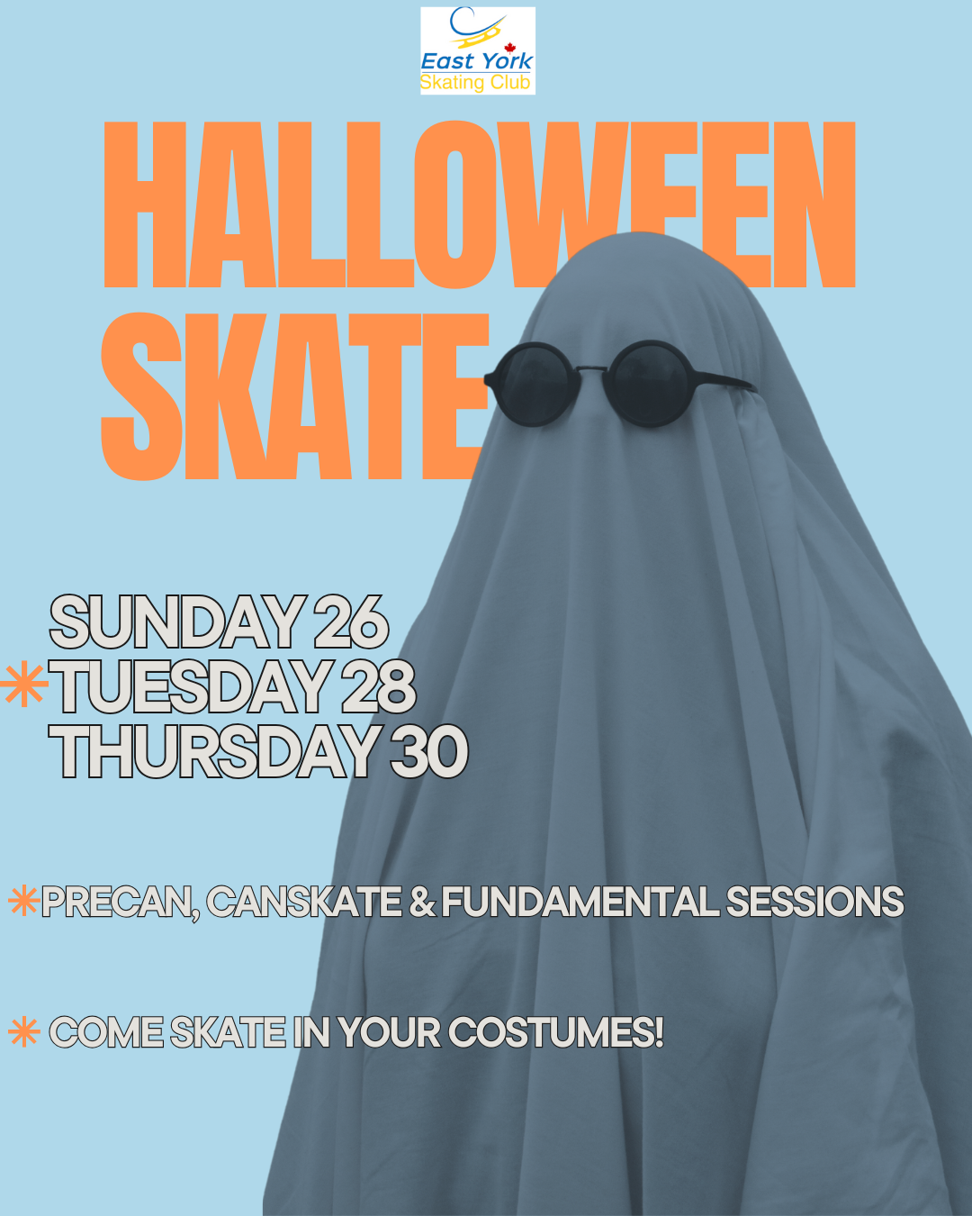 Join us for our Halloween Skate on Sunday, October 26, and again on Tuesday, October 28 and Thursday, October 30. Skaters in our CanSkate, Pre-Can, and Fundamentals sessions are invited to come dressed in their Halloween costumes — just make sure to stay warm and safe while skating!